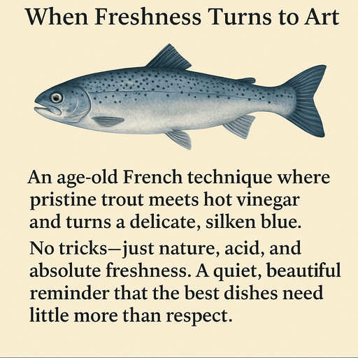 In fine French restaurants that specialise in truite au bleu, live trout are kept in aerated tanks. They are pulled just before service and prepared swiftly. The result is a dish that looks almost ethereal. The skin is pale and bluish. The flesh beneath is tender. Its flavour is clean, delicate, and dignified. (https://www.kookssecrets.shop/)