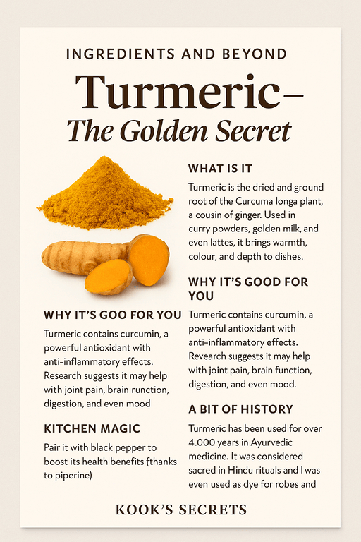 In the world of spices, turmeric shines brightly. This is a golden-hued powder. It is made from the knobbly root of the Curcuma longa plant. It has been a kitchen staple and a healing remedy for ages. It’s the spice that gives curry its sunshine colour and warm, earthy flavour, but it’s also much more than that. Treasured in Indian and Asian cultures for around 4,000 years (mountsinai.org), turmeric has earned names like “Indian saffron” and a reputation as a cure-all. Modern science is now catching up to ancient wisdom, exploring turmeric’s antioxidant, anti-inflammatory, and other health benefits. Let’s discover the secrets of this remarkable spice in true Kook’s Secrets style. We will take a friendly tour through what it is. Learn why it’s good for you. Find out how to use it in the kitchen. Explore the rich history behind it.