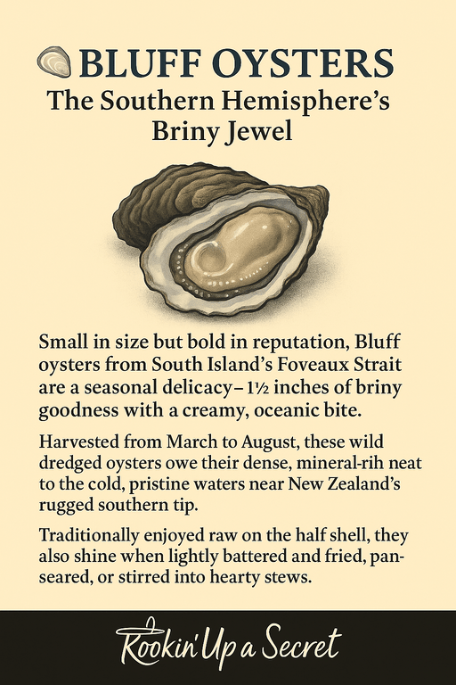 Unlike farmed varieties, Bluff oysters are wild dredged, meaning they grow naturally on the seabed. This results in a dense, mineral-rich meat that reflects their subantarctic environment—cold, brisk, and pure. The oysters are carefully harvested, cleaned, and served with little fanfare—because they simply don’t need it. (https://www.kookssecrets.shop/)