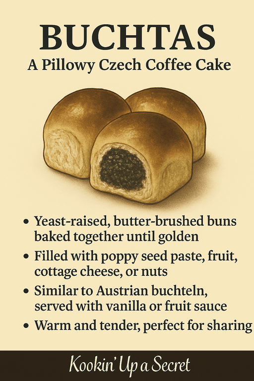 Soft, golden, and gently sweet, Buchtas are a cherished Czech coffee cake—yeast-raised, butter-brushed, and filled with love. These tender buns offer more than just a sweet treat. They might be bursting with poppy seed paste, cottage cheese, fruit preserves, or crushed nuts. They provide a taste of comfort and tradition.