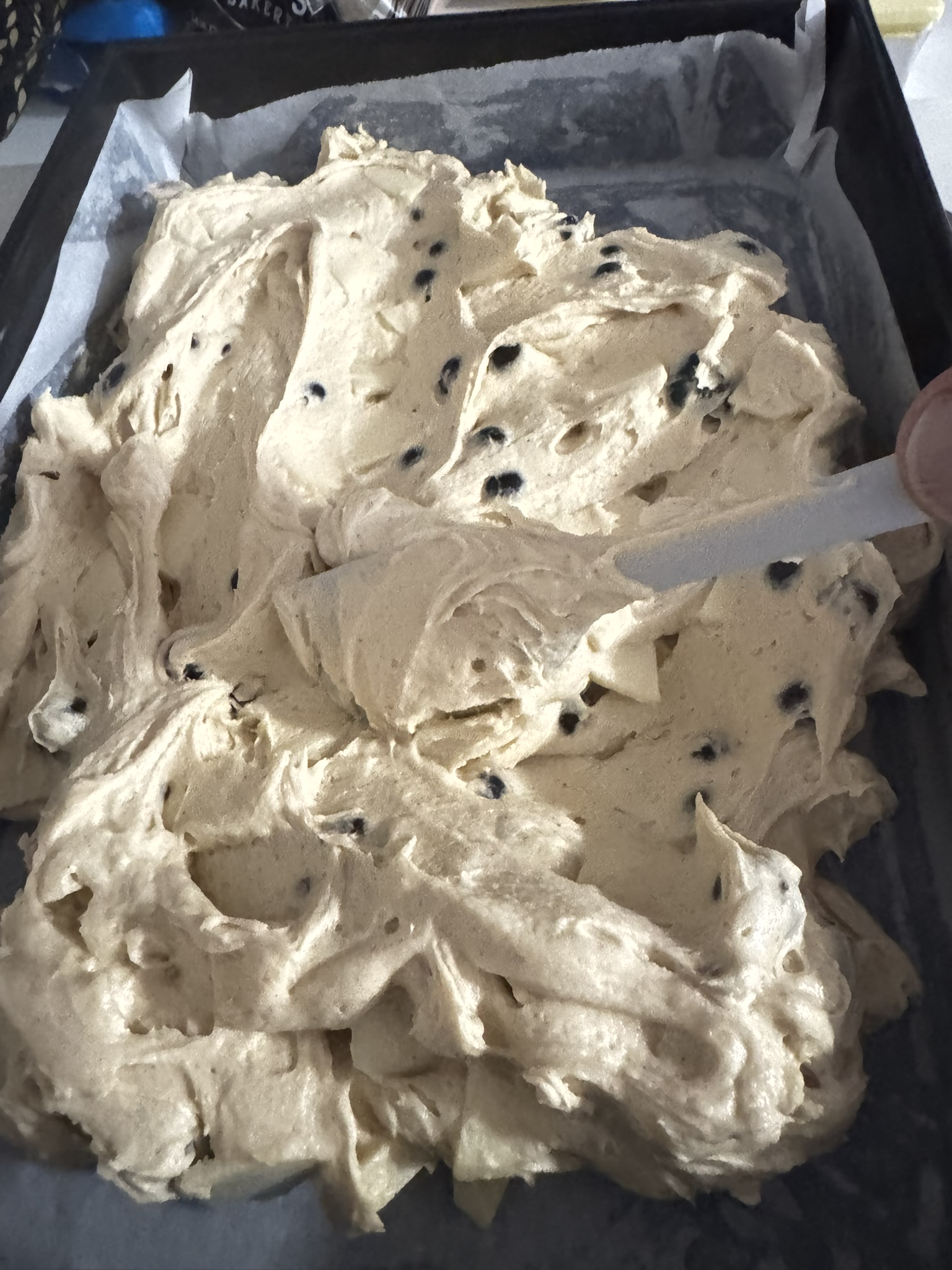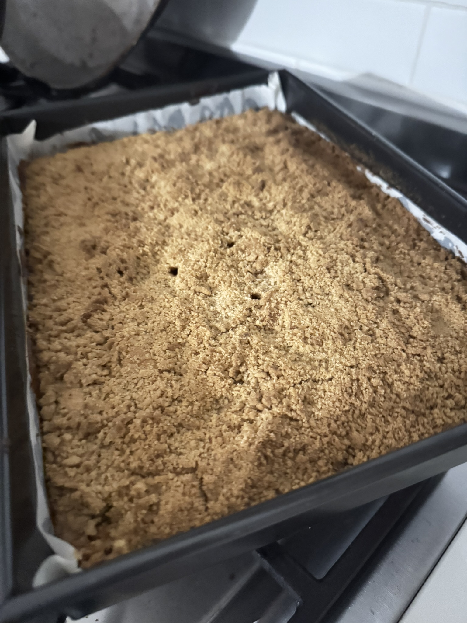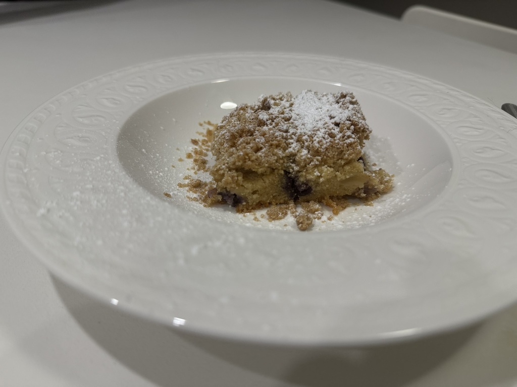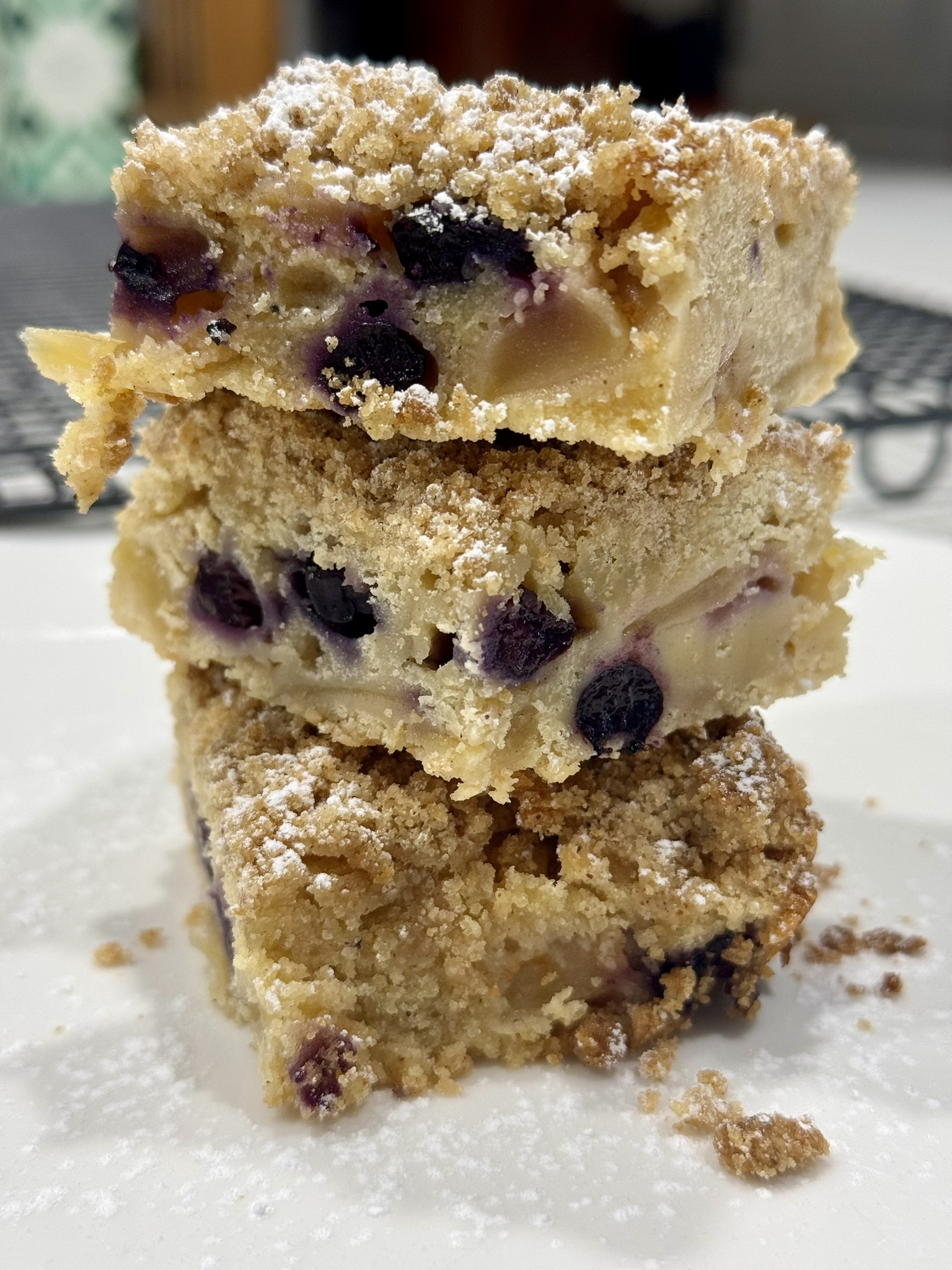 Blueberries, on the other hand, are one of my personal favourites. I’ve always loved the way they burst with juice — sweet yet a little tart, like tiny jewels of flavour. I knew one day I wanted to bring the two together. So, when I decided to create a bake, I blended Mum’s apple crumble memory with my love of blueberries. The result was something special. Soft apple gives body and texture. Blueberries add bright pops of sweetness. A buttery sponge holds everything together. A crumble topping ties it back to the classic I grew up with. (Blueberries).