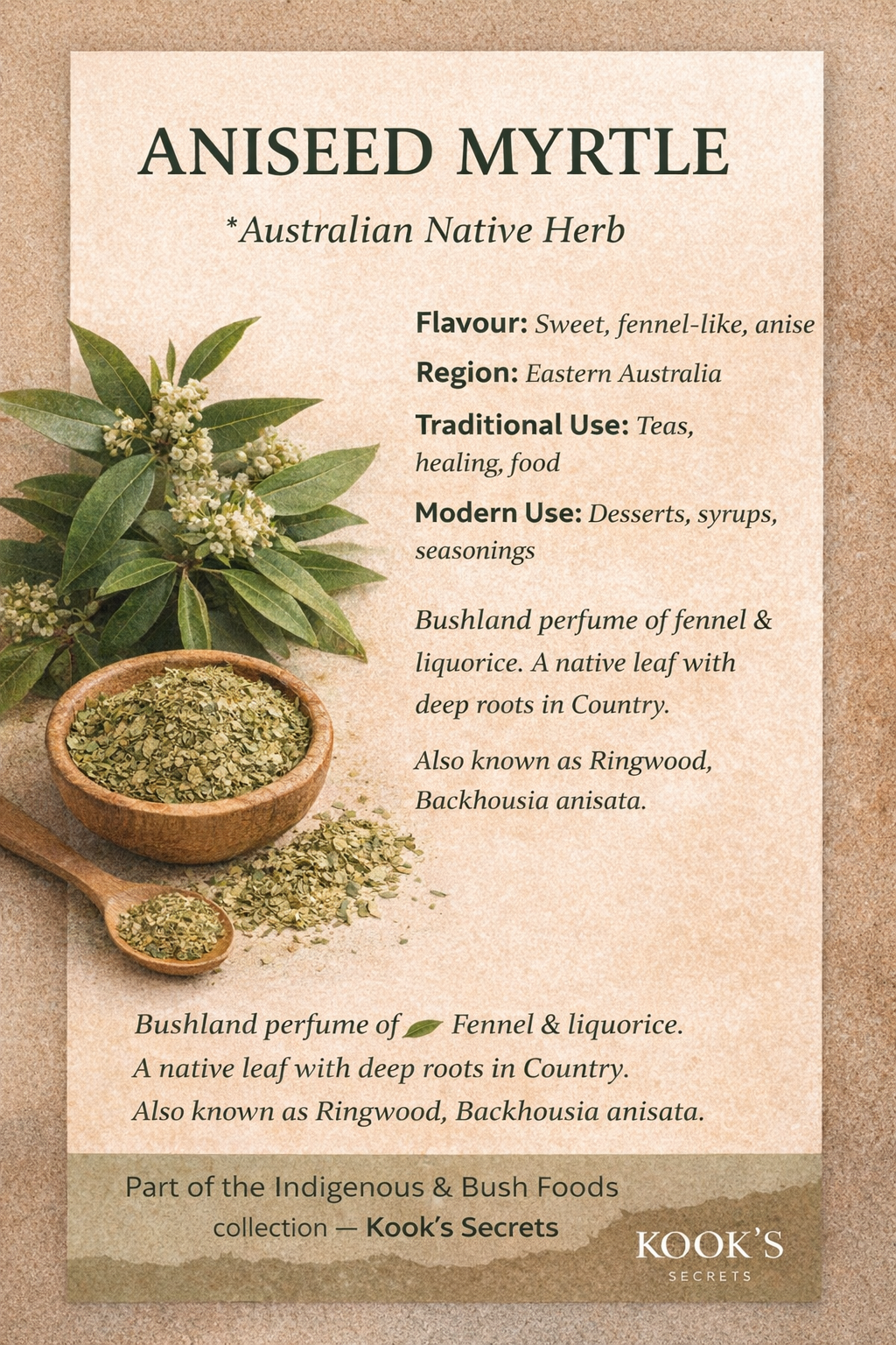 In today’s kitchen, Aniseed Myrtle is prized for its clean, sweet anise character and remarkable versatility.