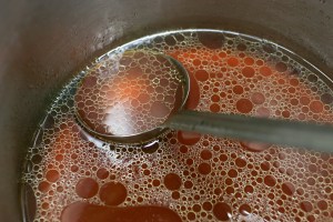 Simmer for 6–8 hours, skimming frequently with a ladle, any impurities and fat that float to the surface of the stock.