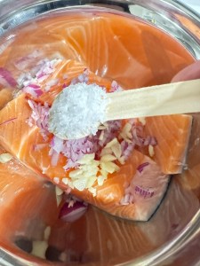 Remove Salmon from the pan, place on a tray/plate, and allow to rest while we cook the garnish and sauce