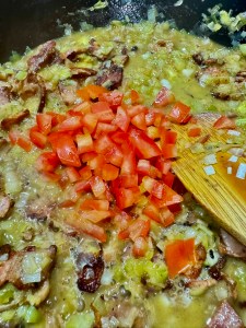 Cut the Bacon in to 5/6 pieces (not to small), then chop the onion, leeks, and tomato flesh into small dice.