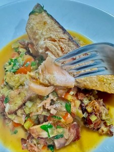 Return the Salmon to the pan and gently warm through with the heat of the sauce.